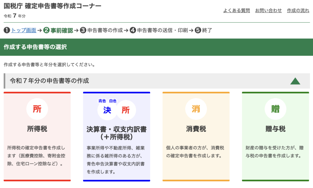 ↓生年月日の入力と、申告する所得の種類を選択します。