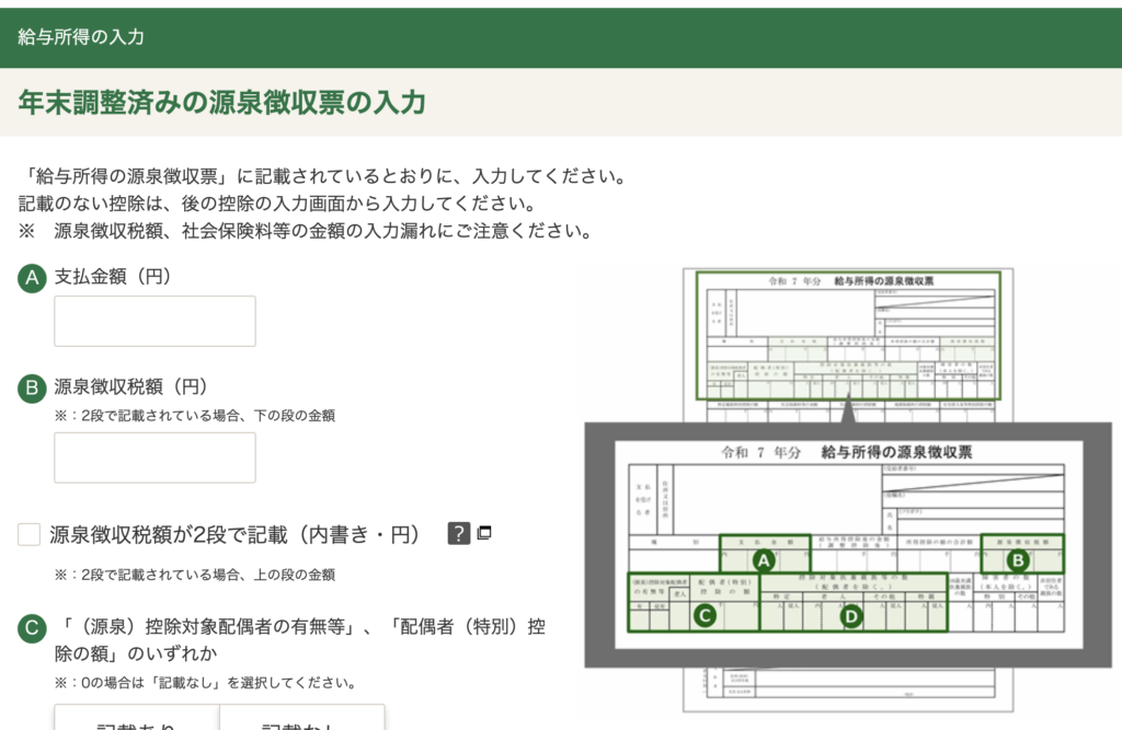 「源泉徴収票(年末調整済み)」の内容を転記していきます。