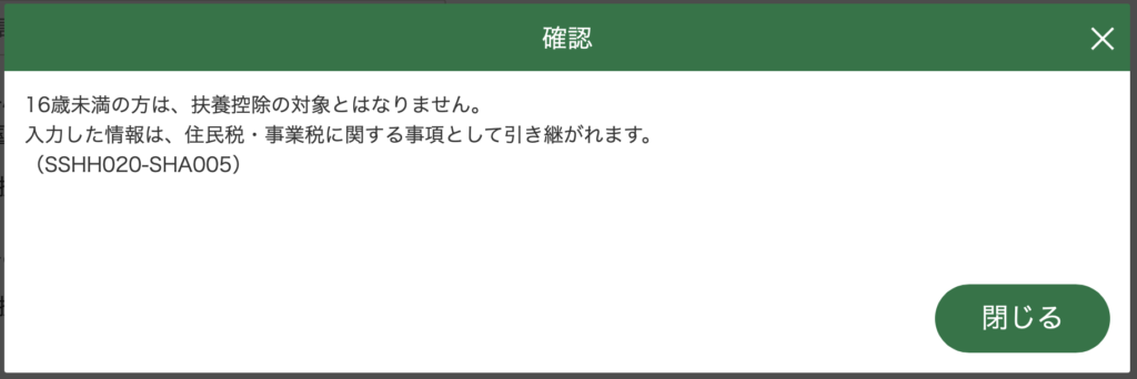 扶養親族に16歳未満の子どもしかいない場合、入力後に以下のメッセージが表示されますが、気にせずに進めましょう。