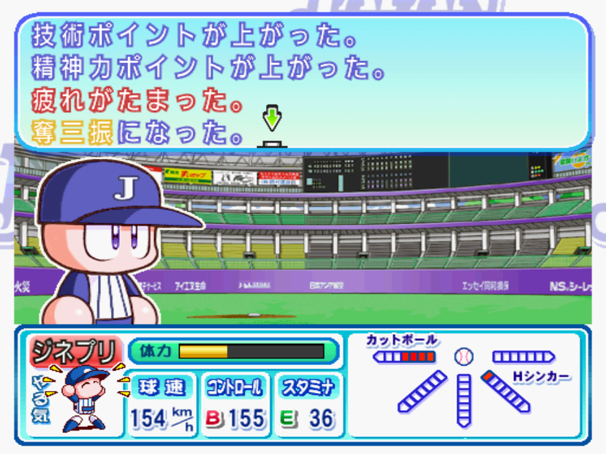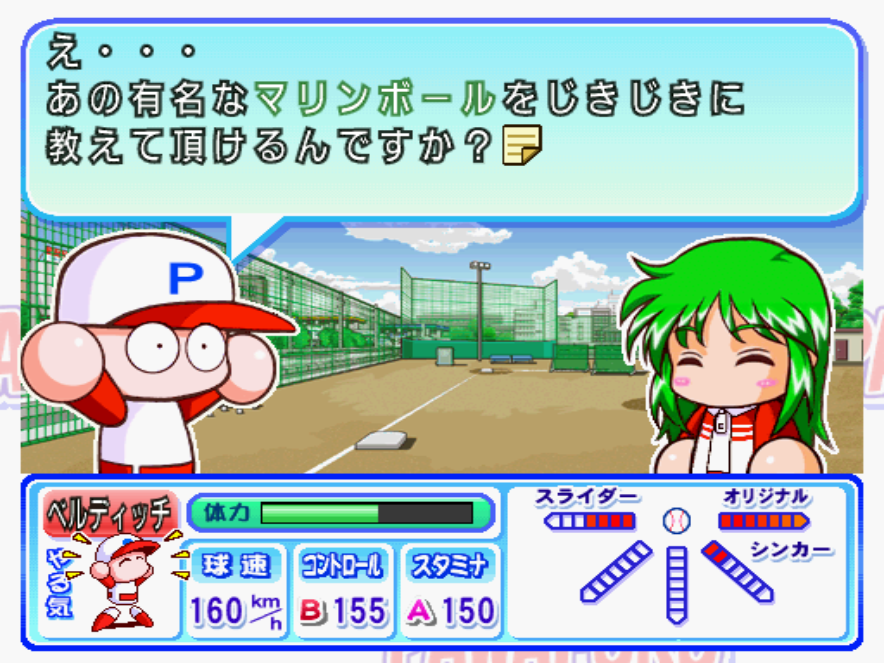 シンカーを取得済で変化球練習をしたとき?に、あおい監督からマリンボールを教わるイベントが発生することがある。